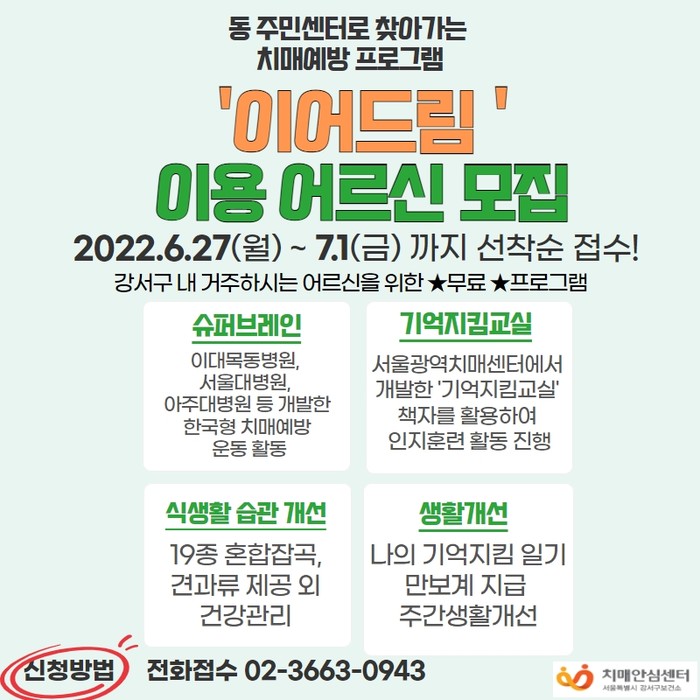[시민일보 = 홍덕표 기자] 서울 강서구(구청장 노현송) 치매안심센터가 오는 7월부터 지역내 20개 전 동 주민센터에서 찾아가는 치매예방 프로그램 '이어드림'을 운영한다.