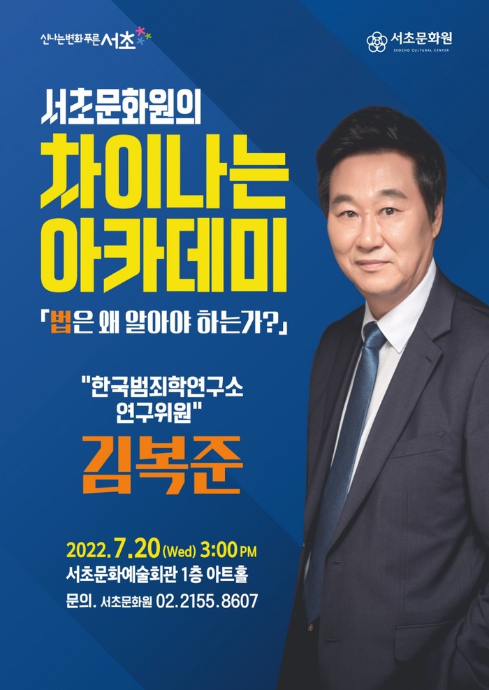 [시민일보 = 이대우 기자] 서울 서초구(구청장 전성수)와 서초문화원은 오는 20일 오후 3시 서초문화예술회관 아트홀에서 ‘차이나는 아카데미’ 한국범죄학연구소 연구위원 김복준 위원의 강연을 개최한다.