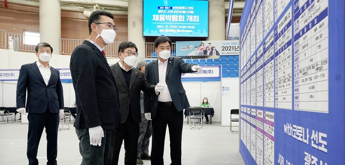 경기 광주시는 지난 17일 ‘with 코로나 선도 광주시 JOB GO(求) 페스티벌!’ 2021년 하반기 광주시 채용박람회를 개최했다. 박람회에는 22개 업체가 참여해 143명 모집에 324명 면접, 63명을 현장에서 채용했다. 사진은 이날 신동헌 시장(오른쪽 두 번째)이 관계자들과 박람회장을 둘러보고 있는 모습. (사진제공=광주시청)