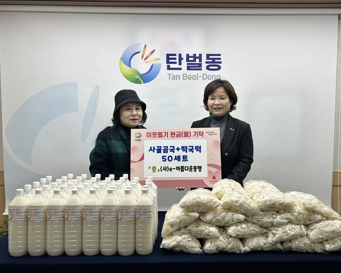 김순희 (사)e-아름다운 동행 대표이사는 15일 경기 광주시 탄벌동 행정복지센터를 찾아 지역내 소외계층의 따뜻한 설 명절을 위해 사골 곰국과 떡국떡 50세트를 기탁했다. 사진은 기탁식에서 관계자들이 기념 촬영을 하는 모습. (사진=광주시청 제공)