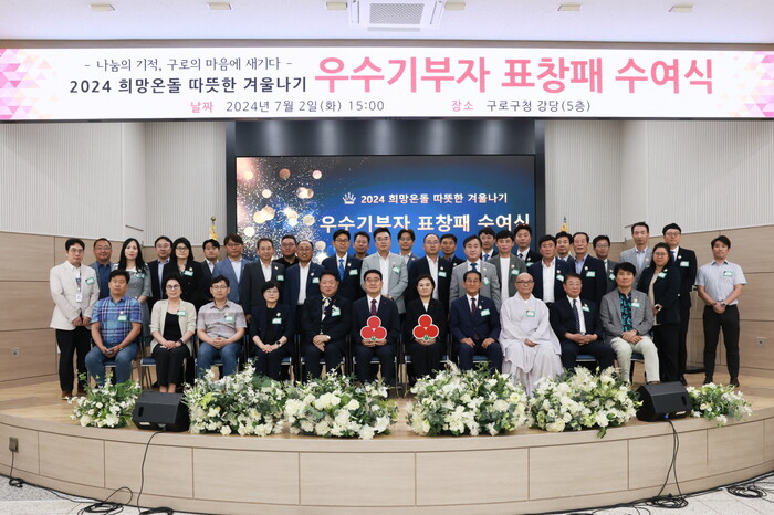 아울러, 2일 구로구청 강당에서 열린 ‘2024 희망온돌 따뜻한 겨울나기 우수기부자 표창패 수여식’에서 문헌일 구청장이 서울사회복지공동모금회로부터 우수 자치구 표창패를 전달받았다. 이후 문 구청장은 우수기부자 51명에게 축하 인사를 전하며 표창패를 수여했다.