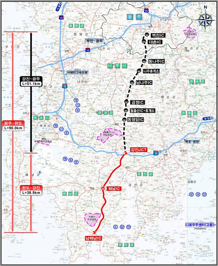 올해 완공되는 노선은 광주광역시 서구 벽진동에서 출발해 강진군 성전면에서 남해고속도로와 분기점(JCT)으로 연결될 예정이다.