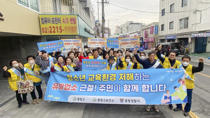 | ▲ 지난 25일, 중랑구 보건소와 중랑경찰서, 면목4동 통장, 학부모 등 60여 명이 참여해 ‘주민과 함께 하는 유해업소 근절 캠페인’을 실시했다. (사진=중랑구청 제공) |