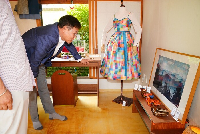 | ▲ ‘종로 경공방 특별전’ 작품을 감상하는 정문헌 구청장의 모습(2024). (사진=종로구청 제공) |