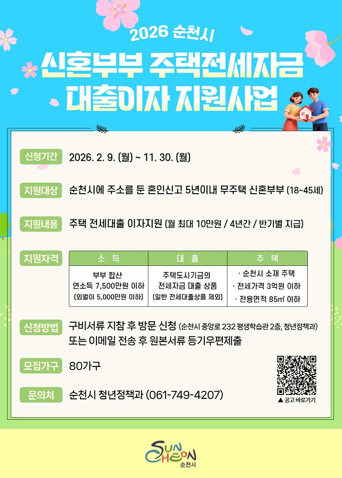 신혼부부 주택전세자금 대출이자 지원사업은 순천시에 거주하는 무주택 신혼부부에게 전세자금 대출이자를 월 10만원씩 최대 4년간 지원하는 사업이다.