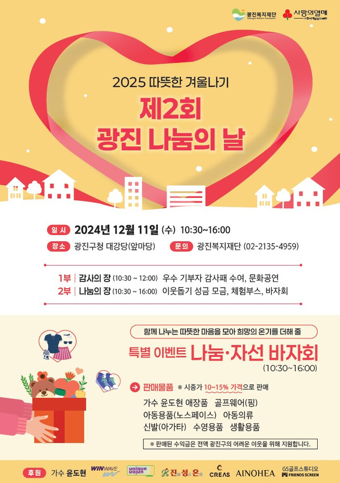 이밖에도 바자회, 기부금품 전달식, 포토존 운영 등 지역주민 모두가 함께 나눔에 참여할 수 있는 소통의 장이 마련돼 있다. 바자회에는 광진구 주민인 인기가수 윤도현이 자신의 애장품을 기부해 눈길을 끌 예정이다.