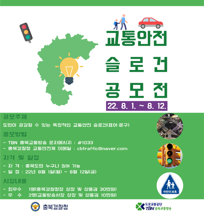 이번 공모전은 충북경찰청·TBN충북교통방송 합동으로 개최하며, 공모 주제는 ‘교통안전 관련 20자 내외의 슬로건(표어·문구)’이다.