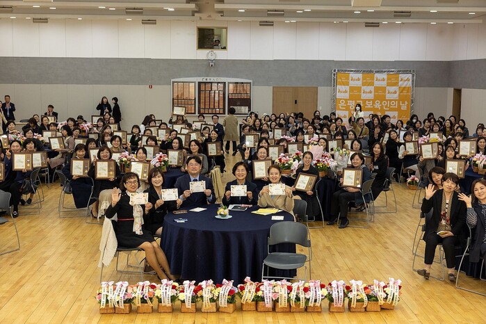 서울 은평구가 최근 ‘제21회 보육인의 날’을 맞아 퇴근 보육사업발전에 기여한 공이 큰 우수 보육 교직원에게 표창장을 수여했다. 사진은 표창 수여식 후 기념촬영을 하고 있는 행사 참가자들의 모습. (사진=은평구청 제공)