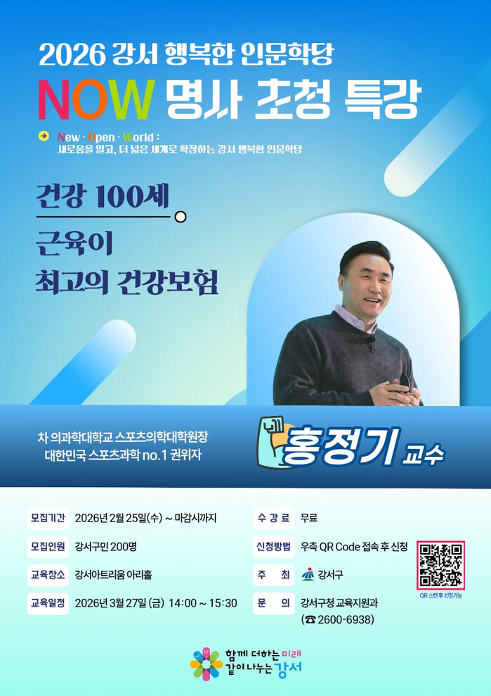 [시민일보 = 박소진 기자] 서울 강서구(구청장 진교훈)는 구민의 삶의 질을 높이고 건강한 일상을 돕기 위해 오는 3월27일 오후 2시부터 3시30분까지 강서아트리움(가로공원로 195)에서 명사초청 강의를 개최한다.