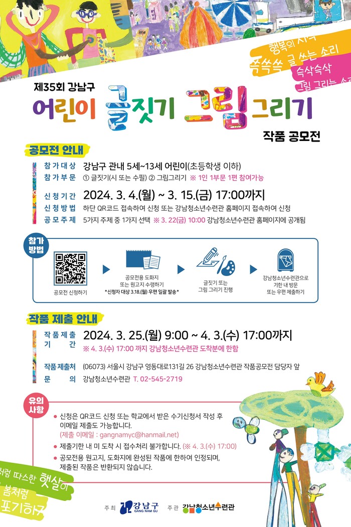 공모전에 참가를 원하는 어린이는 3월 4일부터 15일까지 온라인으로 신청하면 된다. 강남구에 거주하거나 강남구 소재 어린이집·유치원·학교에 재학 중이면 참가할 수 있으며, 강남구청소년수련관 홈페이지 또는 네이버폼을 통해 신청하면 된다. 분야는 글짓기와(시·수필)과 그림그리기 부문으로 이 중 하나만 선택할 수 있다.