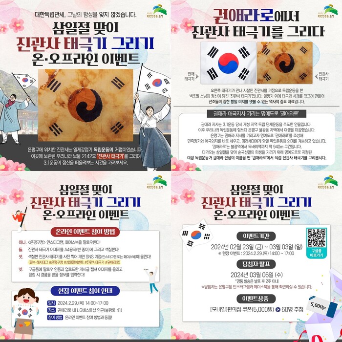 [시민일보 = 이대우 기자] 서울 은평구(구청장 김미경)가 오는 29일 독립운동가의 공훈을 기리고 고결한 독립정신을 널리 알리고자 ‘권애라로’에서 ‘진관사 태극기 그리기 온·오프라인’ 행사를 개최한다.