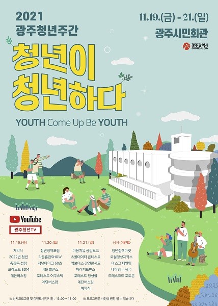 2021 광주청년주간 주요 프로그램은 유튜브 채널 ’광주청년TV“로 실시간 방송되며, 행사에 대한 자세한 정보와 참여방법은 광주청년주간 홈페이지에서 확인할 수 있다.