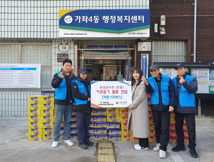 [인천=문찬식 기자] 인천 서구 환경공무관 모임 ‘한울(회장 조성호)’은 지난 9일 지역 내 취약계층을 돕기 위해 라면 100박스를 가좌4동 행정복지센터에 기탁했다. 이번 기부는 겨울철 취약계층의 식생활 부담을 덜고 지역사회에 따뜻한 온기를 전하기 위한 나눔 활동의 일환으로 추진됐다.