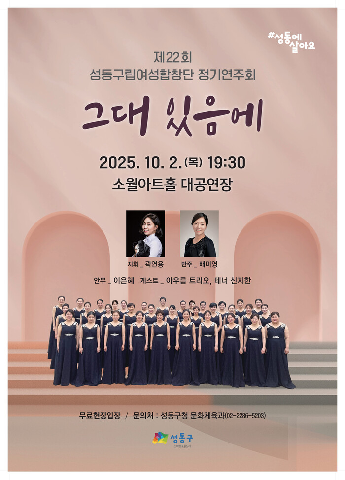 1991년 창단한 성동구립 여성합창단은 성동구를 대표하는 문화사절단으로, 2025년 제3회 남도전국합창대회 대상 수상 등 다수의 외부 무대에서 실력을 인정받고 있다.