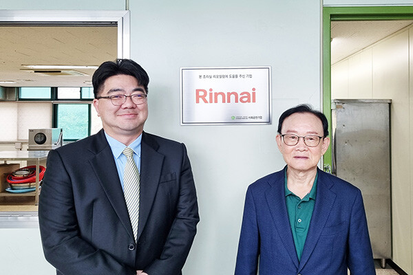 | ▲ 린나이사업전략본부 강상규 부본부장(왼쪽)과 백암재단 윤국진 이사장이 기념촬영을 하고 있다. |