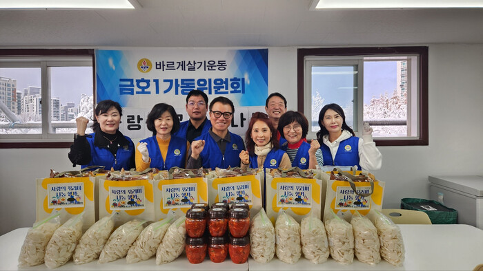 서울 성동구 금호1가동 바르게살기운동위원회가 최근 저소득 취약계층을 위한 ‘사랑의 꾸러미 나눔’ 행사를 진행했다. 사진은 떡국 떡, 깍두기 등이 담긴 꾸러미 앞에서 관계자들이 기념 촬영을 하고 있는 모습. (사진=성동구청 제공)