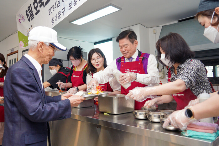 | ▲ 보훈나눔행사에서 이필형 구청장이 국가보훈대상자들을 위해 직접 배식을 하고 있다. (사진=동대문구청 제공) |