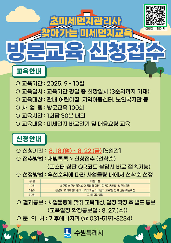 [수원=임종인 기자] 경기 수원시가 미세먼지 위험성과 대응 요령을 안내하는 ‘2025년 초미세먼지관리사 방문교육’에 참여할 시설을 오는 18~22일 모집한다.