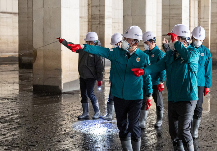 진교훈 서울 강서구청장이 최근 풍수해로 인한 재난과 안전사고에 선제적으로 대비하기 위해 수방시설 점검에 나섰다. 사진은 진 구청장(맨앞 왼쪽)이 관계자들과 함께 시설물을 점검하는 모습. (사진=강서구청 제공)