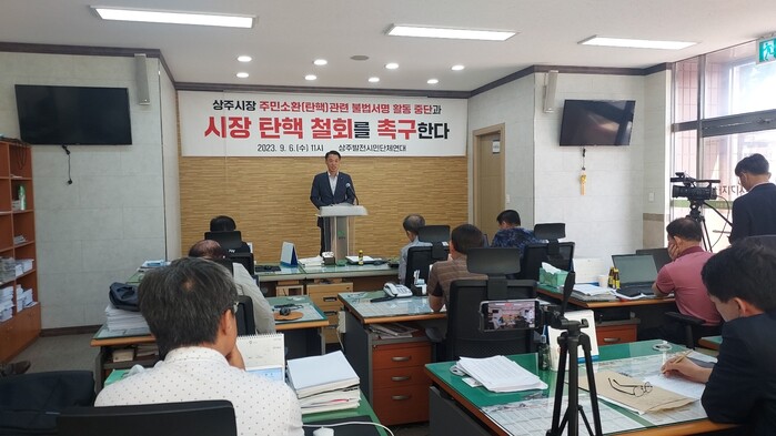 [상주=박병상 기자]상주발전시민단체연대에서는 9월 6일 오전 11시 브리핑센터에서 상주시장 주민소환(탄핵)과 관련하여 불법적으로 자행되는 서명활동 중단과 시장탄핵 철회를 촉구하는 기자회견을 가졌다.