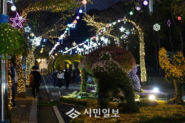 공룡, 꽃 터널, 캐릭터 등 각양각색의 조형물을 활용한 4개의 테마존, 분재국화 전시장 등이 3만여점 다양한 국화로 물들고, 야간에는 LED 경관 조명으로 더욱 아름다워진다.