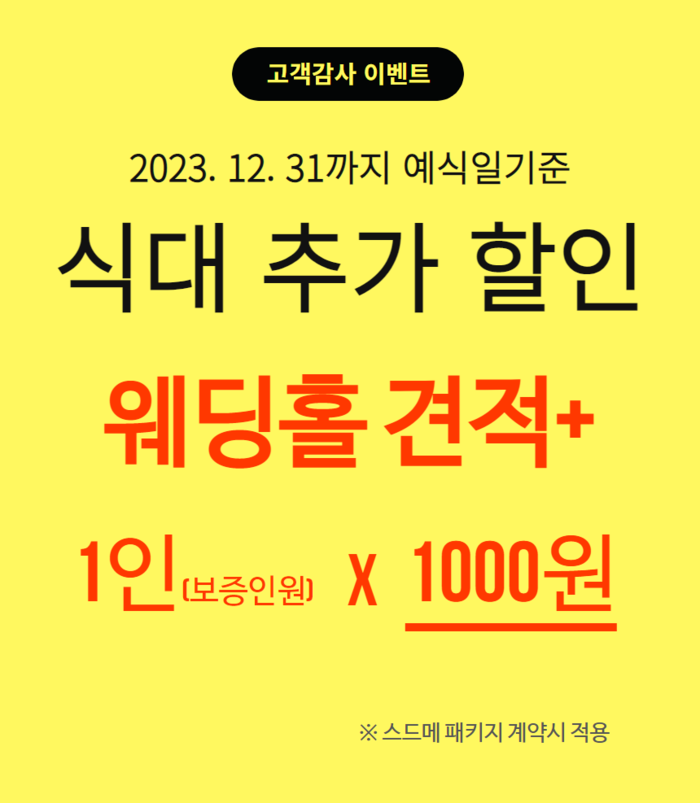 이번 이벤트는 더웨플을 통해서 올해 안에 스드메 패키지 및 웨딩홀 동시 계약 시 적용되며, 웨딩홀 견적 시 1인당 식대 1000원 할인으로 예를 들어 보증인원 200명 계약 시 20만원 할인이 적용된다.
