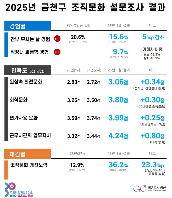 [시민일보 = 여영준 기자] 금천구(구청장 유성훈)는 지난 5월 말 직원을 대상으로 실시한 ‘2025년 금천구 조직문화 설문조사’ 결과, 공직사회 내 불합리한 관행이 완화되고 전반전인 조직문화가 개선되고 있다고 15일 밝혔다.