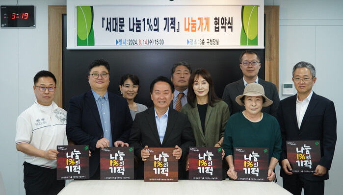 [시민일보 = 이대우 기자] 서울 서대문구(구청장 이성헌)가 최근 구청장실에서 ▲에이치엠씨 ▲리메인더스 사회적협동조합 ▲연세우유 연세대리점 ▲(주)비갠하늘 ▲(주)한국효온과 ‘서대문 나눔1%의 기적’ 82∼86호점 공동 협약을 체결했다.