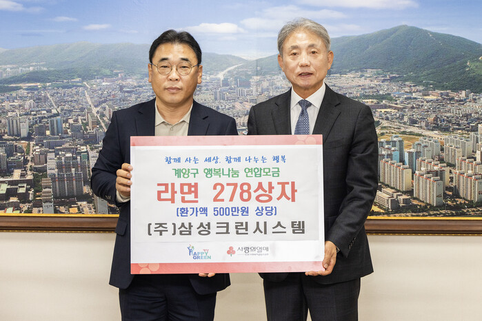 [인천=문찬식 기자] 인천 계양구(구청장 윤환)는 11일 (주)삼성크린시스템(대표 권동옥)이 취약계층 지원을 위한 라면 278상자(20개입, 환가액 500만 원 상당)를 기탁했다고 밝혔다.