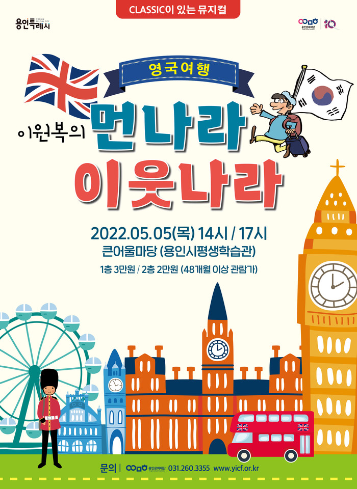 [용인=오왕석 기자] (재)용인문화재단(이사장 백군기)은 클래식이 있는 뮤지컬 <이원복의 먼나라 이웃나라 영국여행>을 5월 5일 어린이날 14시, 17시에 큰어울마당에서 진행한다.
