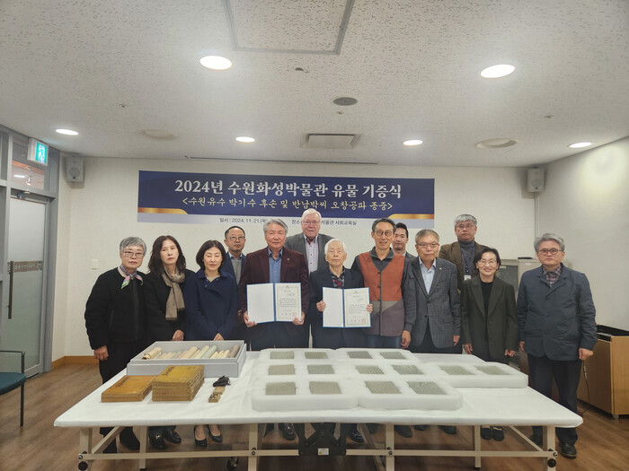 조선시대 순조(재위 1800~1834)대 수원유수를 지낸 박기수의 후손과 반남박씨 오창공파 종중(宗中)이 소장 유물을 경기 수원화성박물관에 기증했다. 사진은 기증식에 참석한 관계자들이 기념 촬영을 하는 모습. (사진=수원시청 제공)