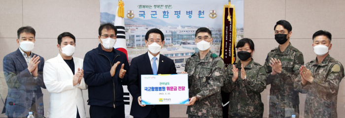 | ▲ 전남도, 국군함평병원 입원 국군장병 위문/사진 좌측 3번째 이상익 함평군수, 네번째 김영록 전남도지사(출처=전남도) |