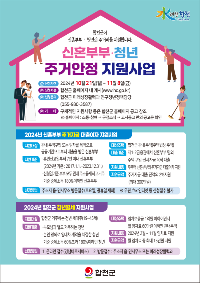 ‘신혼부부 주거자금 대출이자’는 주거자금 대출 잔액의 2%(최대 300만원)을 지원하며, 지원 대상은 공고일 기준 합천군에 주민등록이 되어 있는 혼인신고일로부터 7년 이내의 신혼부부(2023년 기준: 2017.1.1. ~ 2023.12.31.)로, 기준 중위소득이 부부합산기준 180% 이하이며, 합천군 관내 주택에 거주해야 한다.