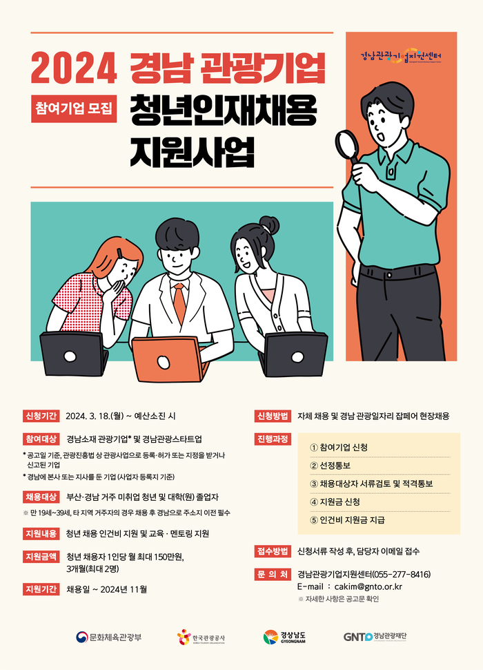자체 채용은 18일부터 참여기업을 모집하고 있으며 자세한 내용은 경남관광기업지원센터 홈페이지 공고문을 통해 확인할 수 있다.