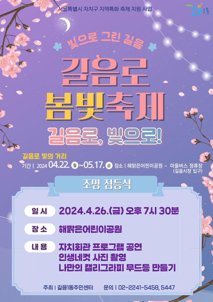[시민일보 = 변은선 기자] 서울 성북구(구청장 이승로) 길음1동 주민센터는 오는 5월17일까지 ‘길음로, 빛으로! 2024 길음로 봄빛축제’를 연다고 밝혔다.