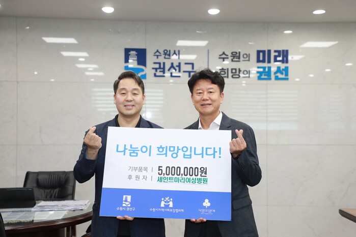 경기 수원시 권선구가 19일 지역내 세인트마리 여성병원으로부터 후원금 500만원을 기탁받았다. 사진은 기탁식에 참석한 김종석 구청장(오른쪽)이 김동주 병원장과 기념촬영을 하고 있는 모습. (사진=권선구청 제공)