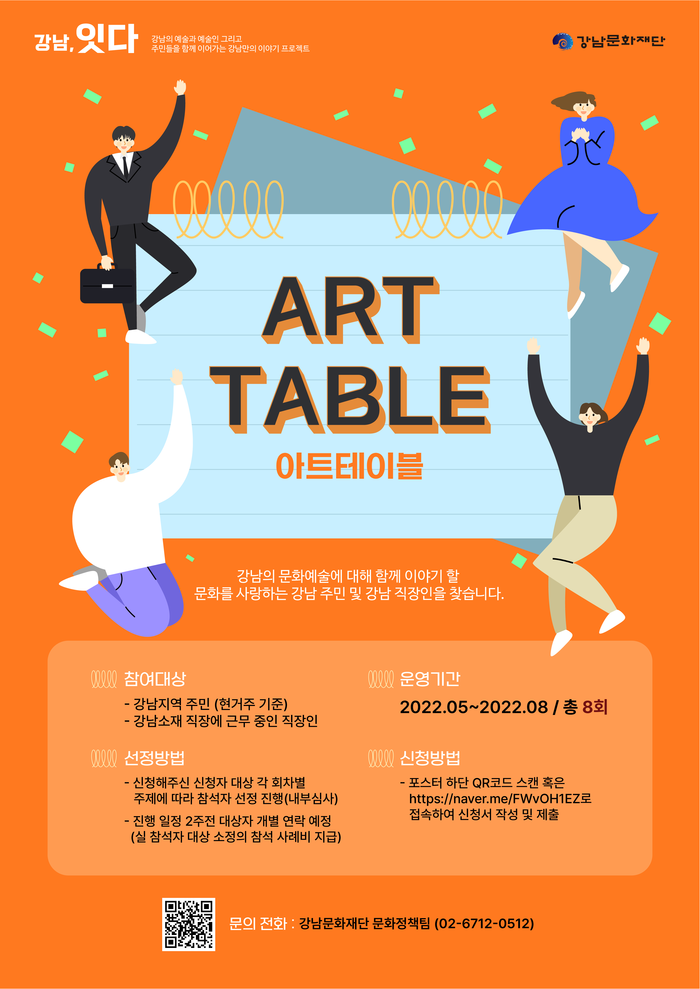 <아트테이블: 강남, 잇다>는 문화예술에 관심이 많고 라운드테이블에 참여하기 희망하는 강남주민 및 강남 직장인 누구나 참여할 수 있다. 참여 신청은 네이버 폼을 통해 신청할 수 있으며, 기타 자세한 내용은 강남문화재단 홈페이지 또는 강남문화재단 문화정책팀으로 문의된다.