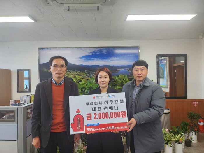 주식회사 청우건설은 “지역 내에서 사업을 하면서 받은 도움을 주변에 어려움을 겪고 계시는 분들께 환원하고자 기탁하게 되었다”며 “추운 겨울 홀로 지내고 계실 분들께 저의 작은 기부로 조금이나마 희망을 나누고 싶다”고 밝혔다.