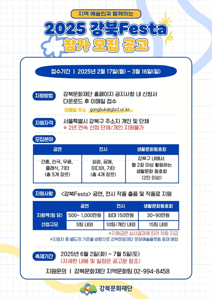 [시민일보 = 문민호 기자] 서울 강북문화재단(대표이사 서강석)은 지역내 지역예술인과 함께하는 ‘2025 강북Festa’ 참여자를 오는 16일까지 모집한다.