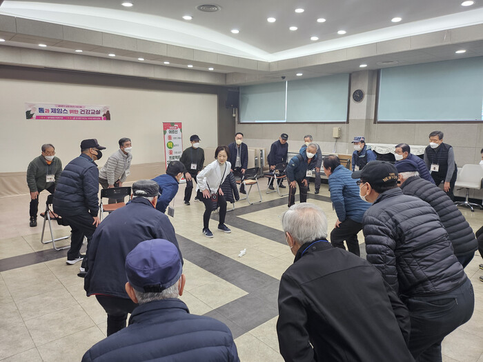 | ▲ '톰과 제임스 건강교실'에 참여한 어르신들이 재활 운동을 하고 있다. (사진=동대문구청 제공) |
