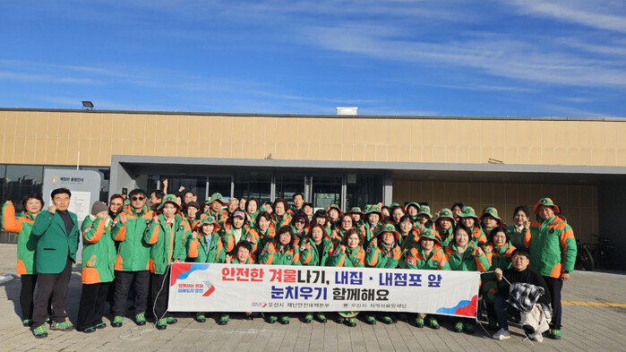 경기 오산시가 최근 지역자율방재단 및 공무원 등 50여명이 참한 가운데, 내삼미동 일대에서 ‘내 집 내 점포 앞 눈 치우기 운동’ 캠페인을 진행했다. 사진은 캠페인 관계자들이 기념 촬영하는 모습. (사진=오산시청 제공)