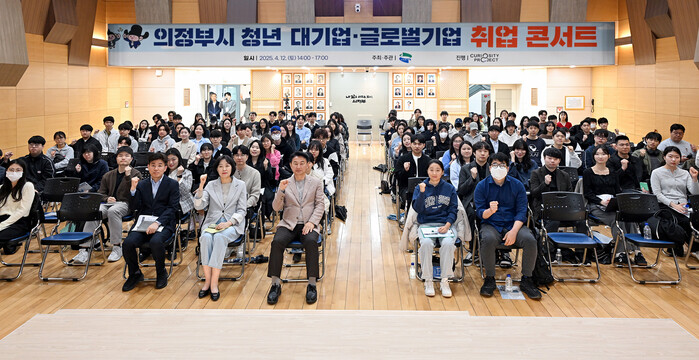 경기 의정부시가 최근 시청 대강당에서 ‘2025 청년 취업 콘서트’를 성공적으로 개최했다. 사진은 콘서트에서 김동근 시장이 참여자들과 기념 촬영을 하는 모습. (사진=의정부시청 제공)