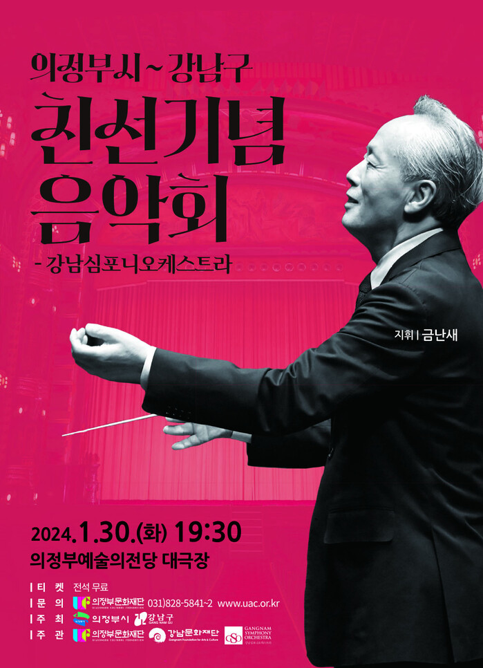 [시민일보 = 이대우 기자] 서울 강남구(구청장 조성명)가 친선결연도시 경기 의정부시와 함께 오는 30일 오후 7시30분~9시30분 의정부예술의전당 대극장에서 음악회를 진행한다.