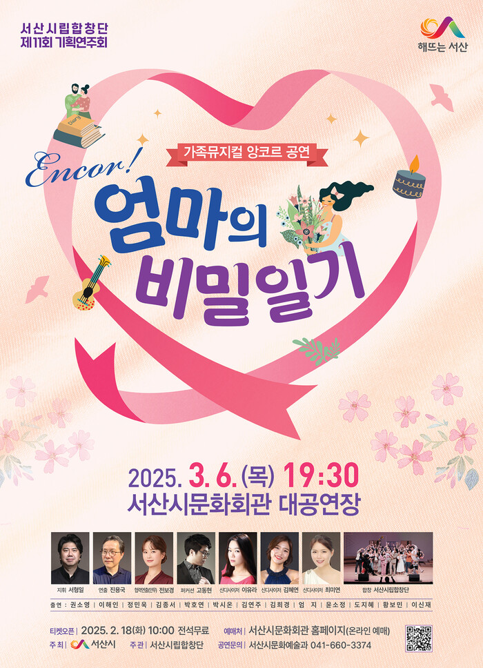[서산=최복규 기자] 충남 서산시는 시립합창단이 2024년 3월 큰 호응을 얻었던 ‘엄마의 비밀일기’를 제11회 기획 연주회로 다시 선보인다고 10일 밝혔다.