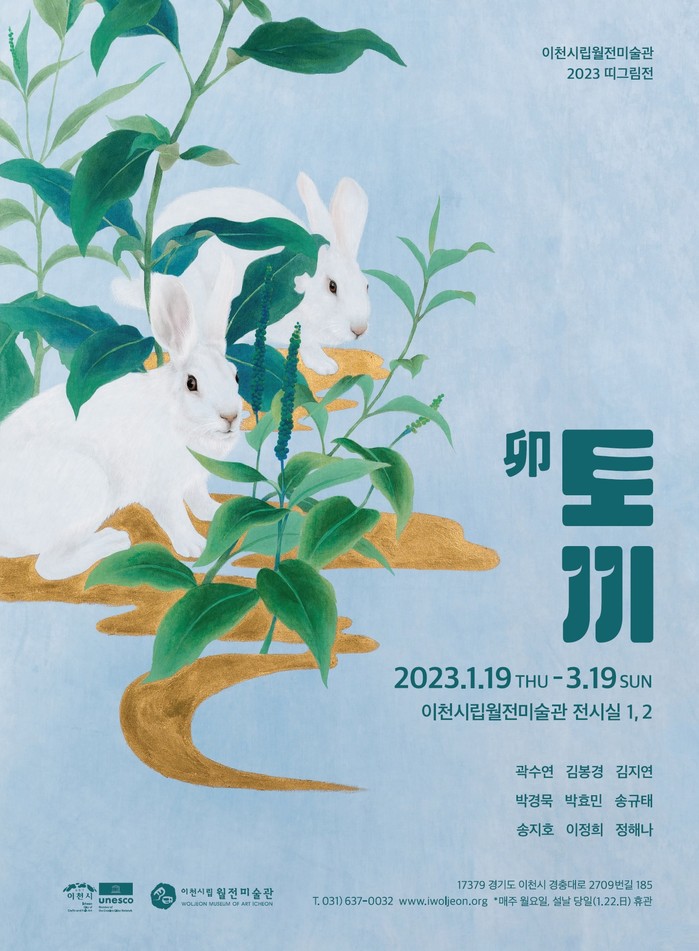 이천시립월전미술관은 2023 계묘년癸卯年을 맞이하여 띠 그림전 <토끼卯>를 준비하였다. 계묘년은 검은 토끼의 해로 토끼는 십이지신十二支神 중 네 번째 동물이다. 토끼는 작고 민첩한 동물로 설화나 다양한 이야기 속에 등장했고 옛 그림 속에서 달, 계수나무, 호랑이, 바위 등 다양한 소재와 함께 결합되어 길상의 의미를 강조하며 애호되었다.