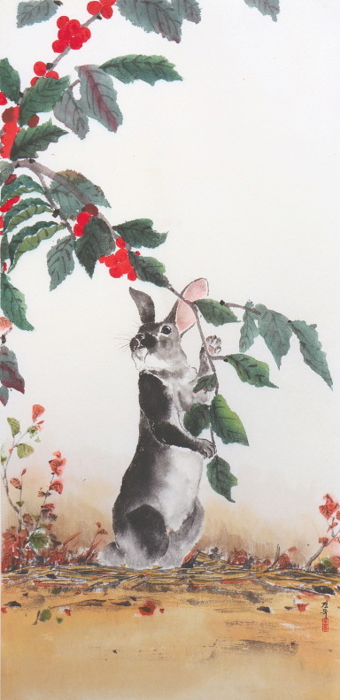 | ▲ 박경묵|열매를 가진 토끼|72x35, 한지에 먹, 채색, 2023 |