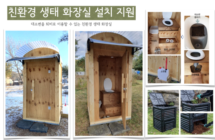 친환경 화장실은 EM, 톱밥, 부엽토 기타 미생물 활용으로 인해 악취 발생이 없어 사용과 관리가 편리한 간이 화장실이다.
