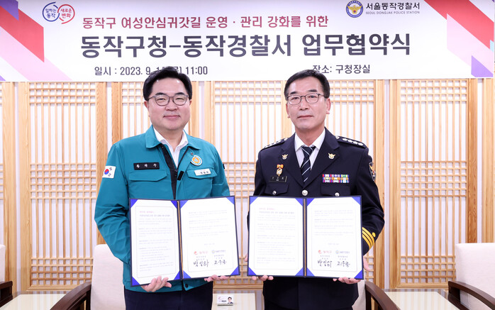 [시민일보 = 여영준 기자] 서울 동작구(구청장 박일하)는 최근 동작경찰서와 안전한 밤 귀갓길 환경 조성을 위해 ‘여성안심귀갓길 업무협약(MOU)’을 체결했다고 15일 밝혔다.