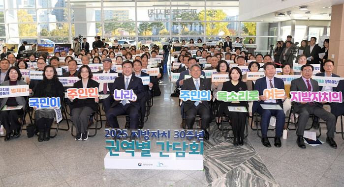 [광주=정찬남 기자] 강기정 광주광역시장(앞줄 왼 쪽부터 다섯 번째)이 10일 오후 시청 시민홀에서 열린 행정안전부 주관 민선 지방자치 30주년 전라권 간담회에 참석해 참석자들과 힘께 기념촬영을 하고 있다. /광주광역시 제공