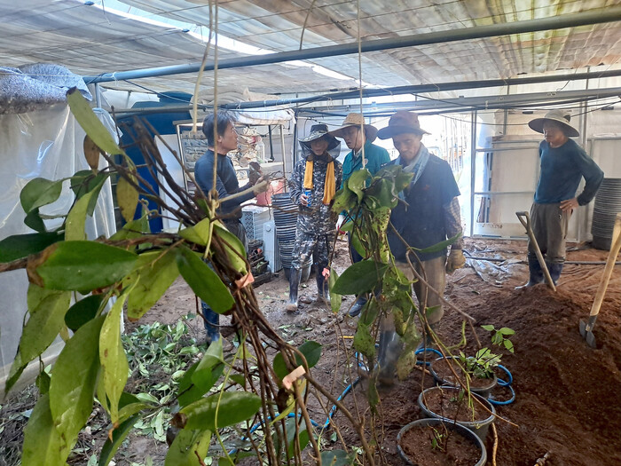 이날 복구지원에 참여한 회원들은 개인소유하고 있는 굴삭기, 전동차, 트럭 등 을 이용하여 하우스내 매몰된 흑노호를 이식한 후 토사와 쓰레기를 정리하였다.